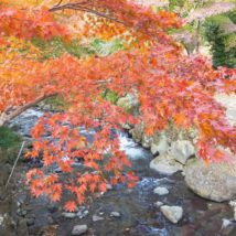 梅園の中に流れる川に沿って紅葉が色を染めてますっ