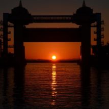 水門に落ちる夕陽 海面にキラキラ続く夕陽の道 なんだか神秘的ね 沼津港 びゅうお