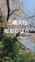 桜散り際の三嶋大社。桜を見上げていると、風が吹くたびに桜が散っていく。それがまたついつい見惚れちゃう