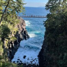城ヶ崎海岸の吊り橋と荒波。 垂直に切り立って高さもあるから怖ーい