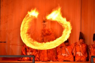 3人の神職によって弓の舞、剣の舞に続いて松明を振りかざして舞う、火の舞が舞殿で奉納されます。